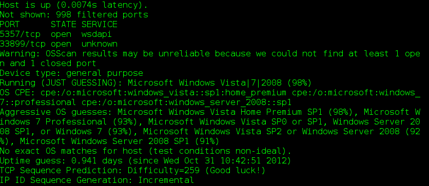 Fig 1: Screenshot of output from an os detecting scan with verbose mode